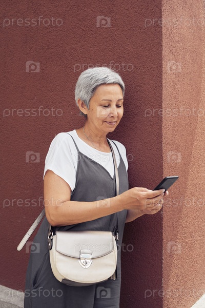 Зрелая женщина использует смартфон в современном городе