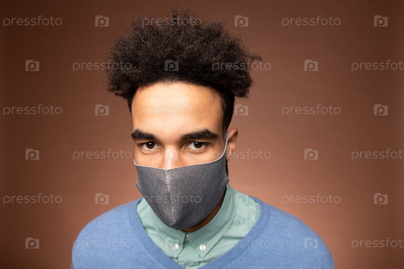 Молодой серьезный бизнесмен смешанной расы в повседневной одежде и серой защитной маске