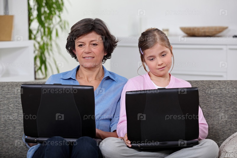 Мать и дочь работают каждая на своем ноутбуке