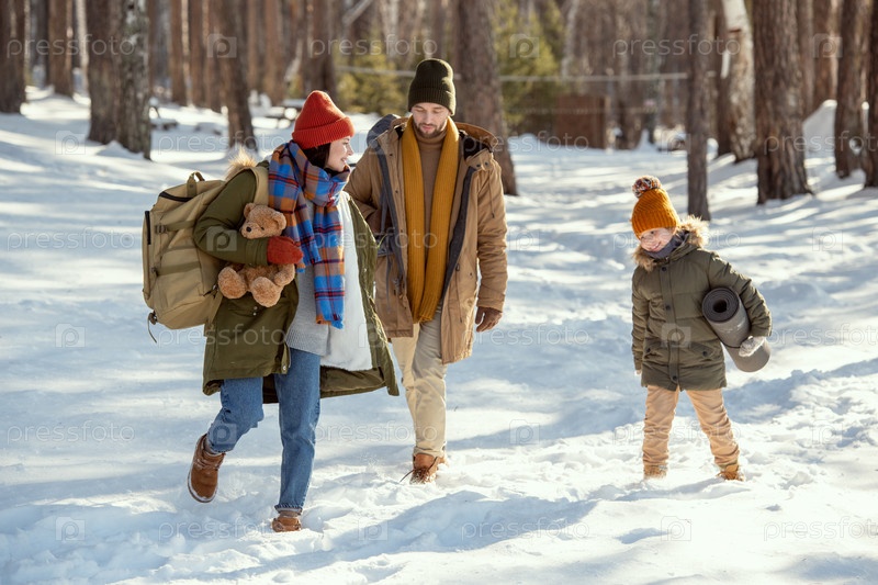 Мать и маленькая дочь в зимней одежде развлекаются с отцом, прогуливающимся рядом