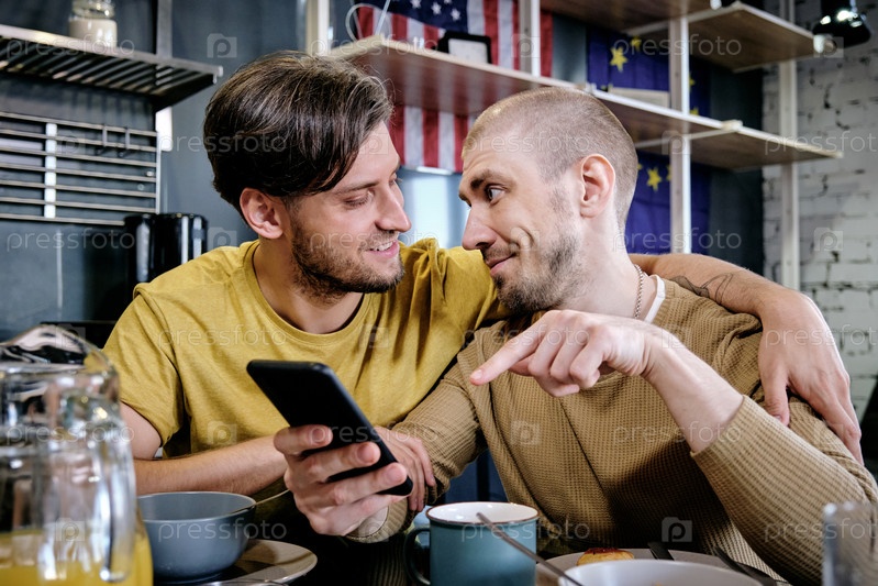 Молодой мужчина обнимает своего парня во время разговора