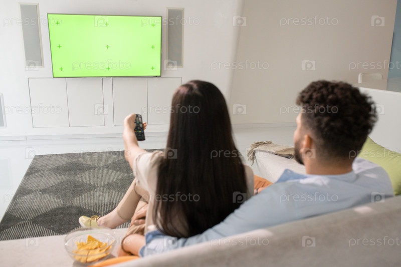 Задний вид молодой пары, сидящей на диване, в то время как брюнетка с пультом дистанционного управления выбирает канал