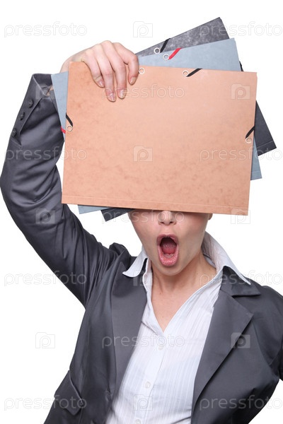 Женщина с открытым ртом закрывается папками