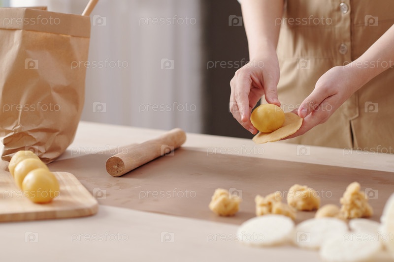 Женщина, которая упаковывает и заполняет тесто