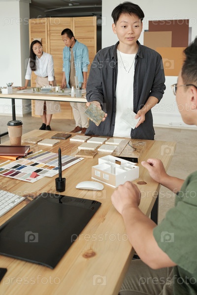 Молодая бизнесвуменка показывает образцы внутренних соединений своему коллеге-мужчине