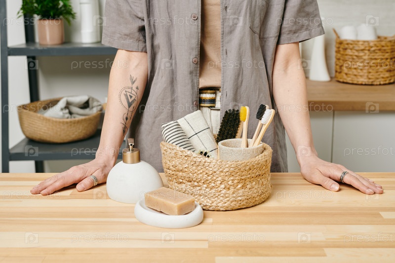 Молодая женщина стоит у корзины с предметами гигиены