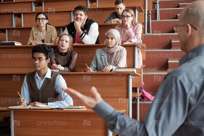 Студенты смотрят на доску, пока учитель что-то объясняет