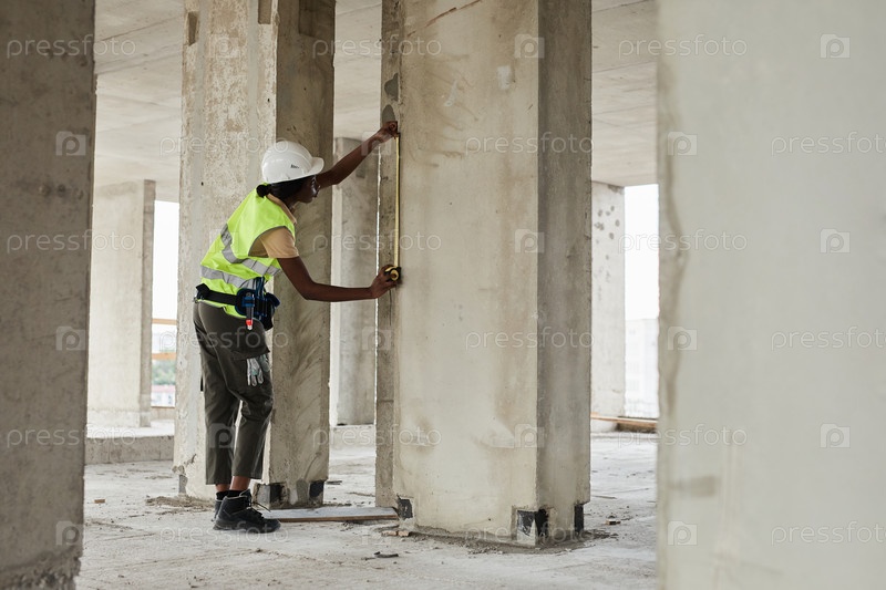 Женщина-строительница измеряет стены