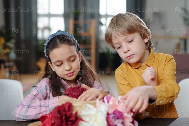 Милый маленький мальчик и девочка сидят за столом и кладут ручные цветы на шляпу