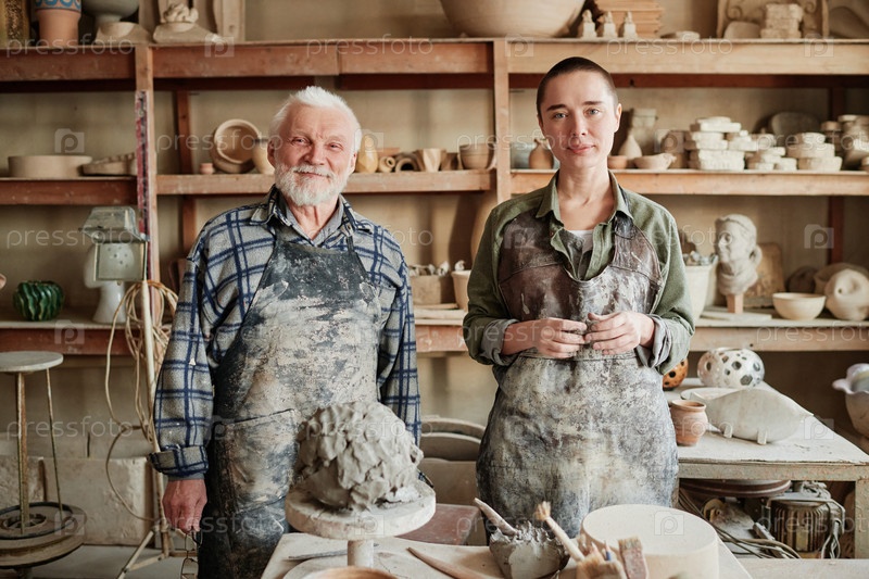 Поттер с помощником, работающим в керамической мастерской