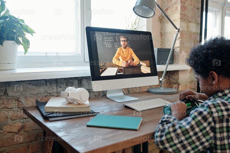 Школьник, сидящий перед монитором компьютера во время онлайн-урока и вынимающий ручку из карандашной коробки
