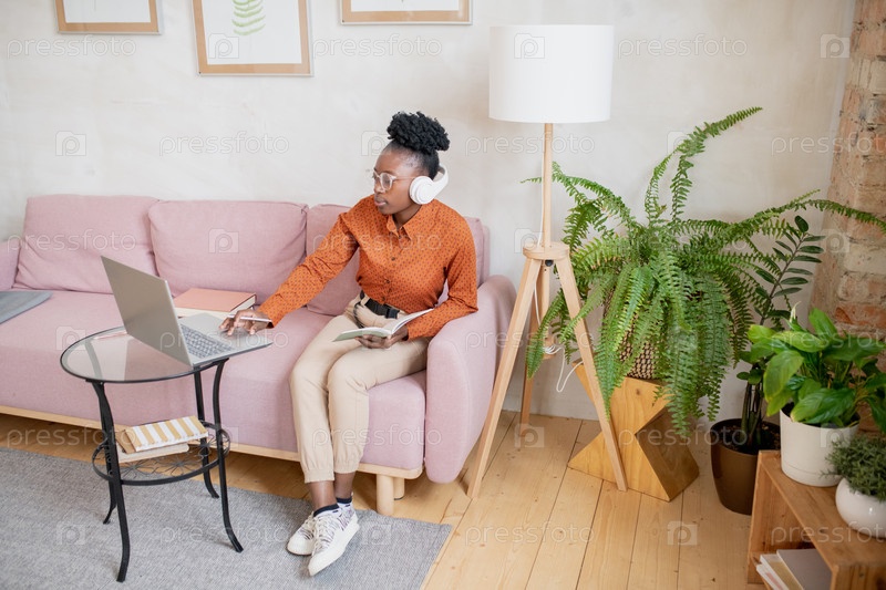 Современная молодая женщина с копирайтером сидит перед ноутбуком