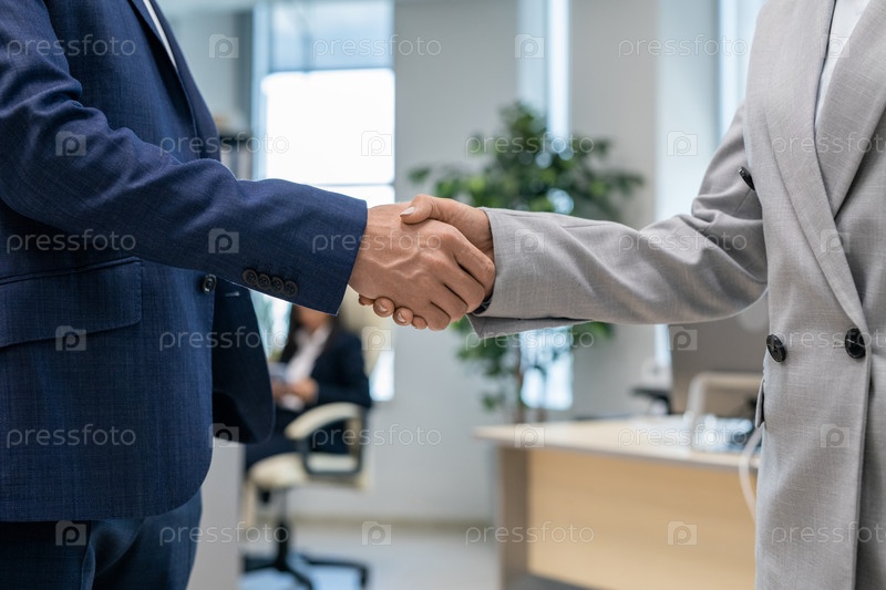 Пожимание рук двух молодых деловых партнеров в офисной среде