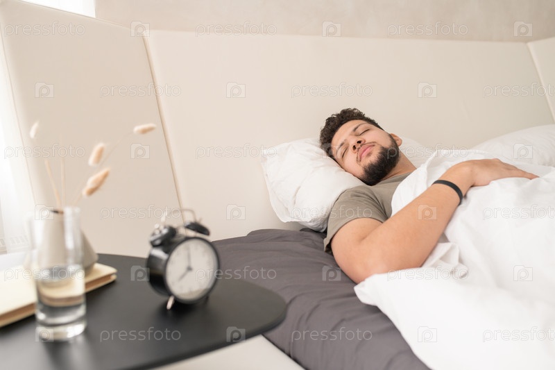 Мирный молодой человек спит в постели