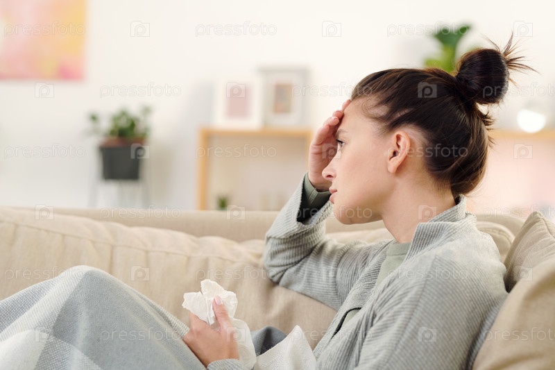Боковой вид молодой больной женщины со сморщенным платкам, сидящей на диване