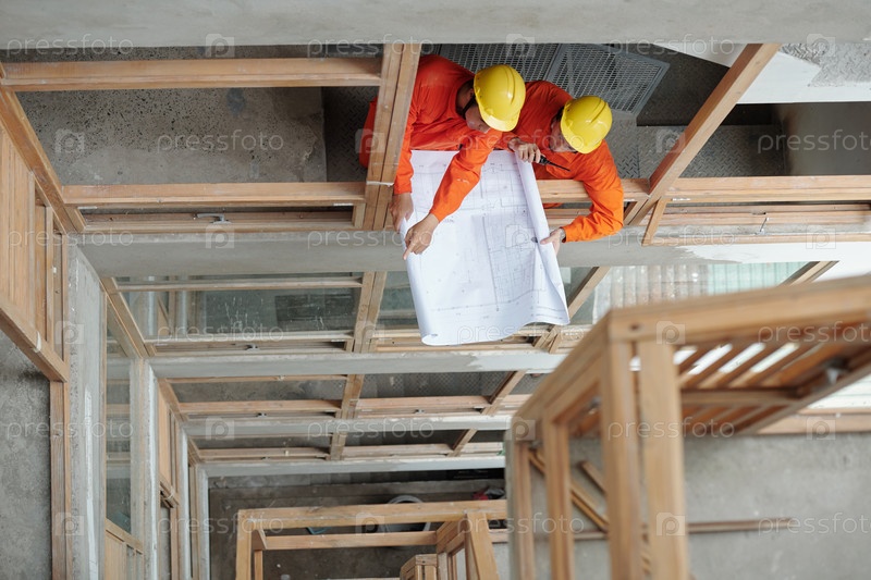 Строительные рабочие обсуждают план дома