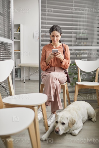 Молодая женщина ждет с собакой в ветеринарной клинике