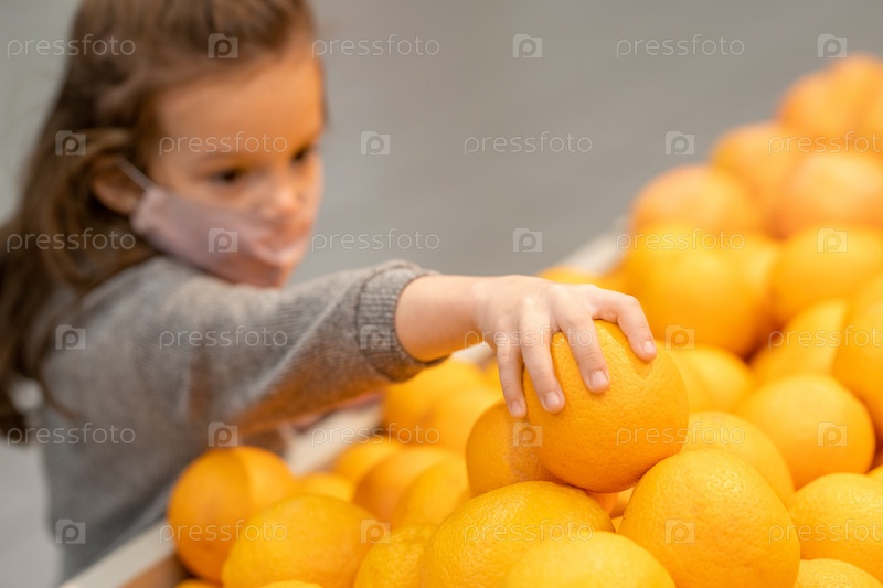 Рука милой маленькой девочки в повседневной одежде и защитной маске, берущей свежий апельсин