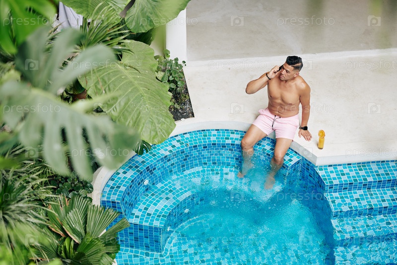 Мужчина, принимающий солнечные ванны, разговаривает по телефону
