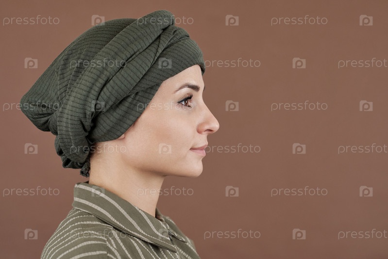 Боковой вид молодой безмятежной женщины в тюрбане и повседневной рубашке