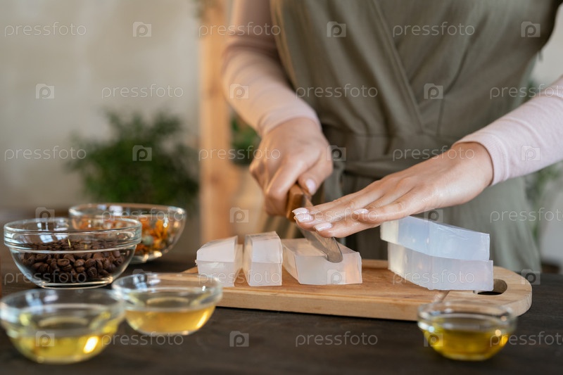 Руки двух молодых женщин, режущих твердую мыльную массу в кубики на деревянных досках