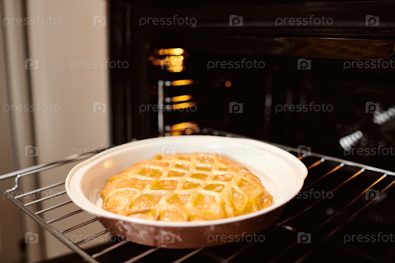 Горячий свежий яблочный пирог в виде выпечки, стоящий на стойках электрической печи