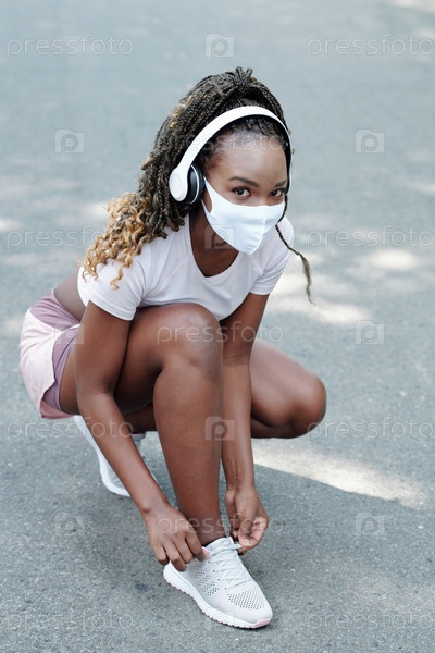 Красивая женская джогерка, завязывающая шнурки обуви