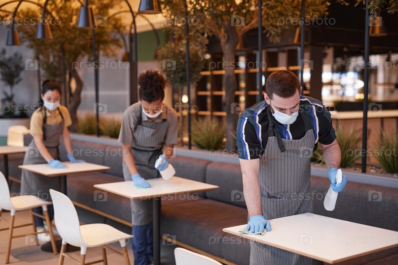 Работники дезинфицируют кафе-столы