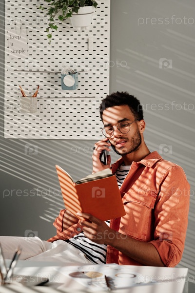 Серьезный молодой чернокожий бизнесмен в очках и непринужденной рубашке сидит под светом через жалюзи и звонит клиенту, проверяя записи в дневнике