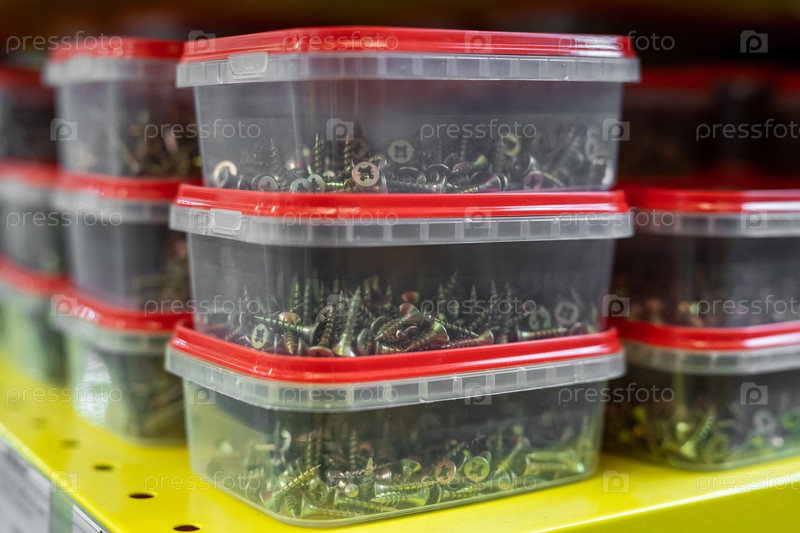 Несколько стеков пластиковых контейнеров с гвоздями