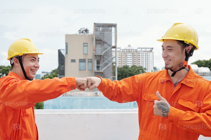 Строительные рабочие дают кулачный удар