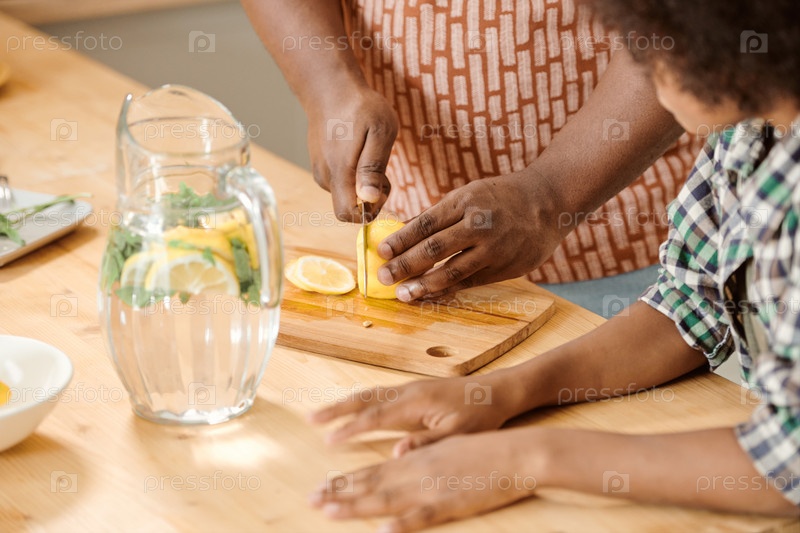 Маленький мальчик стоит рядом со своим отцом и нарезает свежий лимон