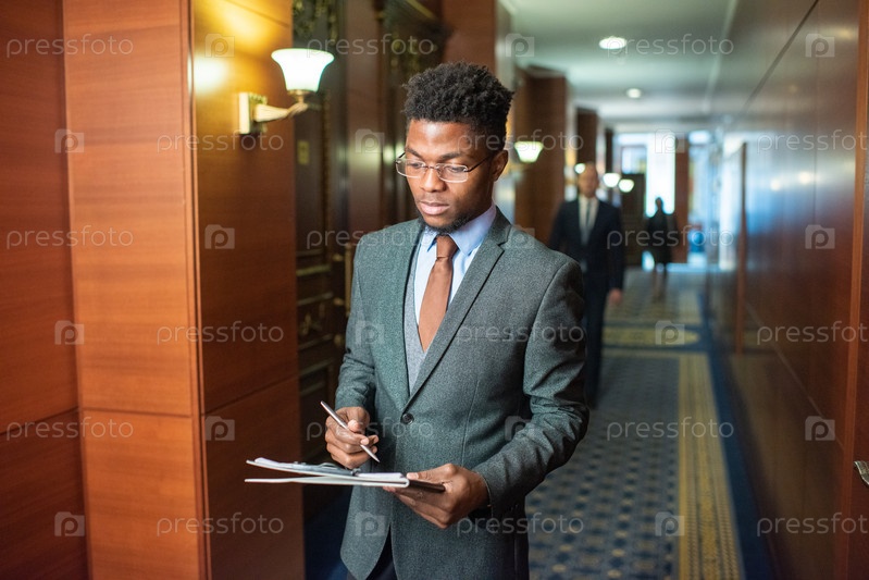 Молодой африканский бизнесмен с щитом стоял в коридоре
