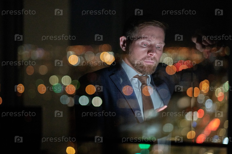 Серьезный бизнесмен с текстовыми сообщениями со смартфона в офисе