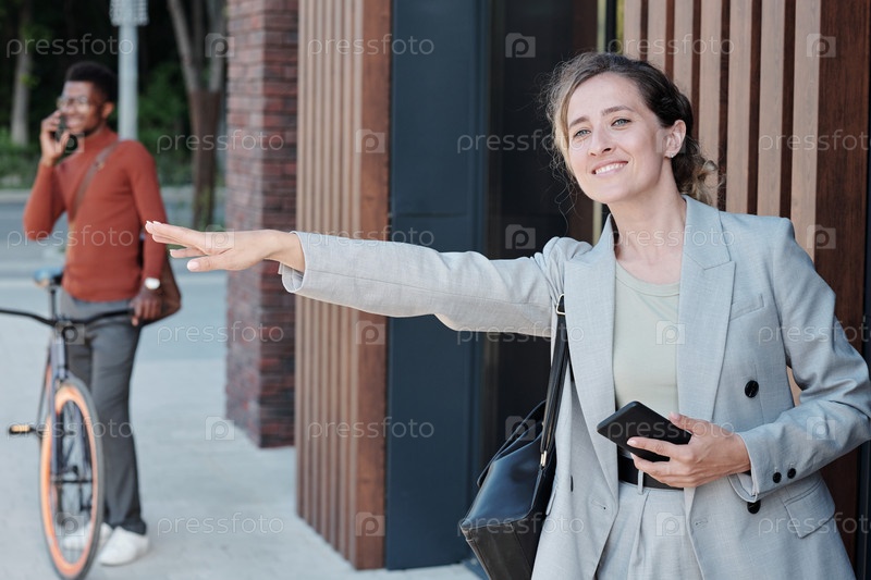 Улыбающаяся бизнесвуменка ловит такси на открытом воздухе
