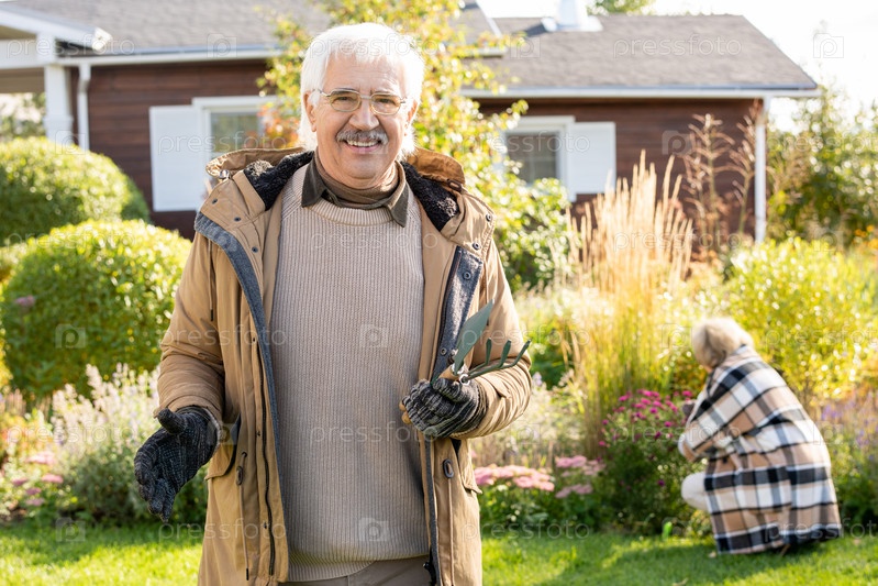 Мужчина-пенсионер в очках и теплой куртке, держащий рабочие инструменты для садоводства