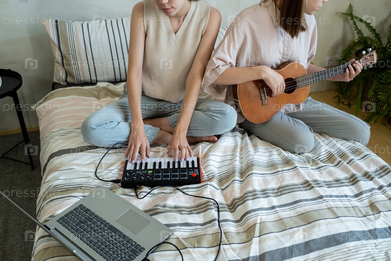 Две девочки-подростки в повседневной одежде играют на музыкальных инструментах