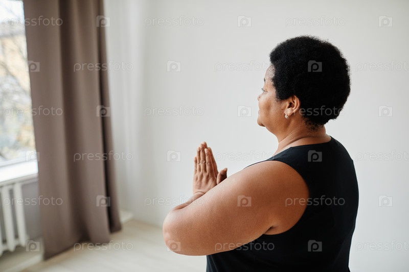 Американская женщина-старший занимается йогой African Side View