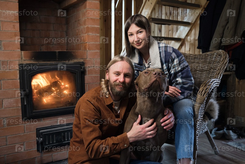 Молодая пара со своей собакой дома