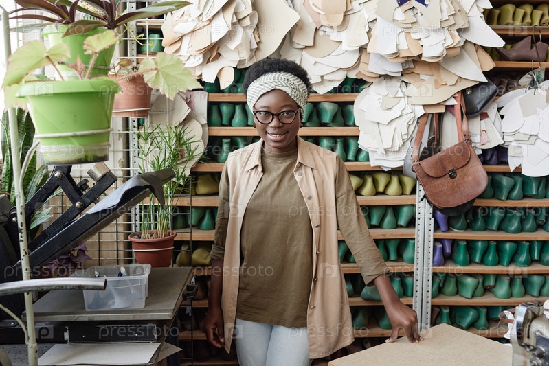 Обувник, стоящий и работающий в мастерской
