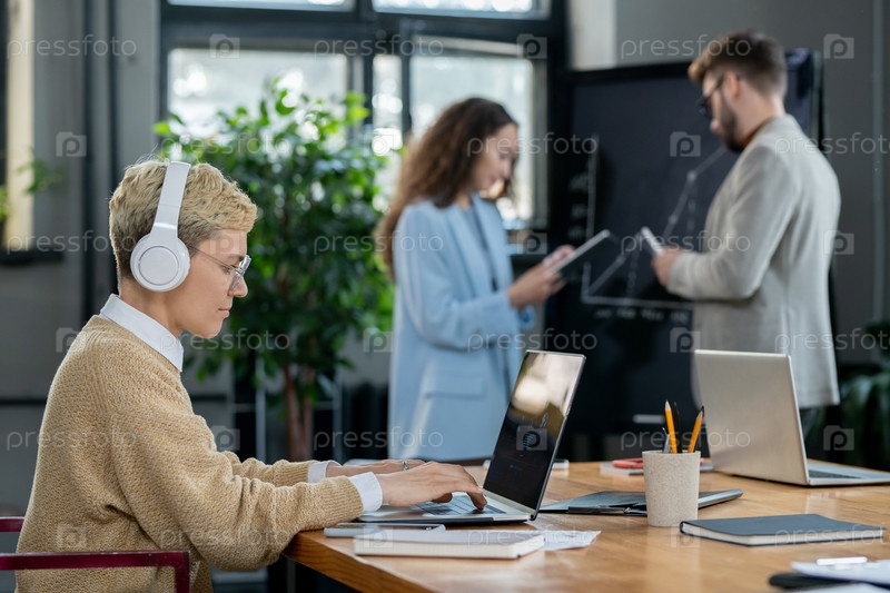 Молодая блондинка-бизнесмен с наушниками в сети перед ноутбуком
