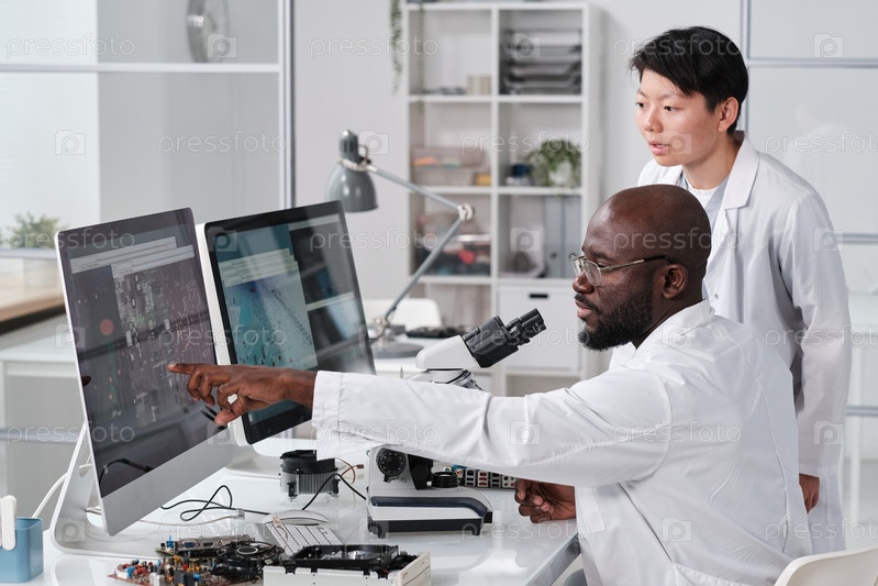 Молодой уверенный в себе ученый указывает на увеличенную схему микрочипа на экране компьютера