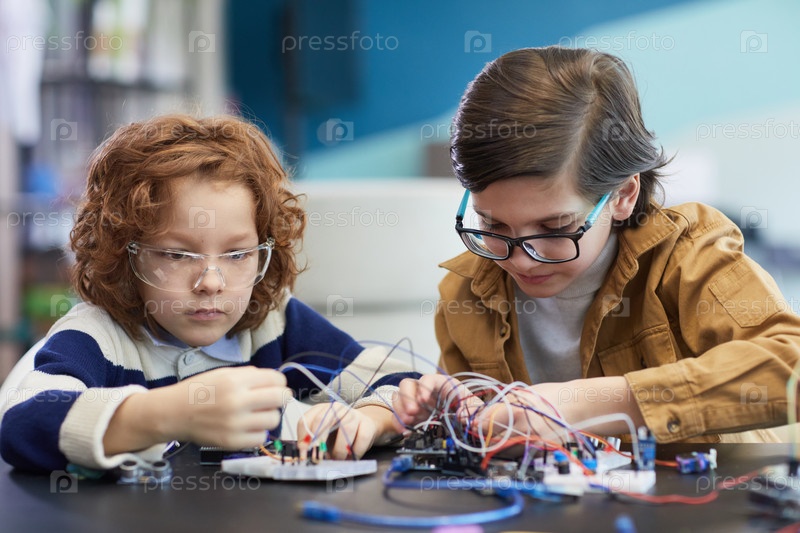 Мальчики наслаждаются классом робототехники в школе