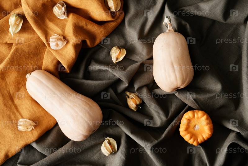 Высокоугольный вид физалисов с закрытыми сухими листьями и вытянутыми и круглыми тыквами на оранжевых и серых тканях