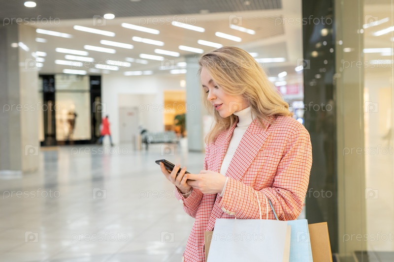 Женщина с бумажными пакетами, использующая смартфон