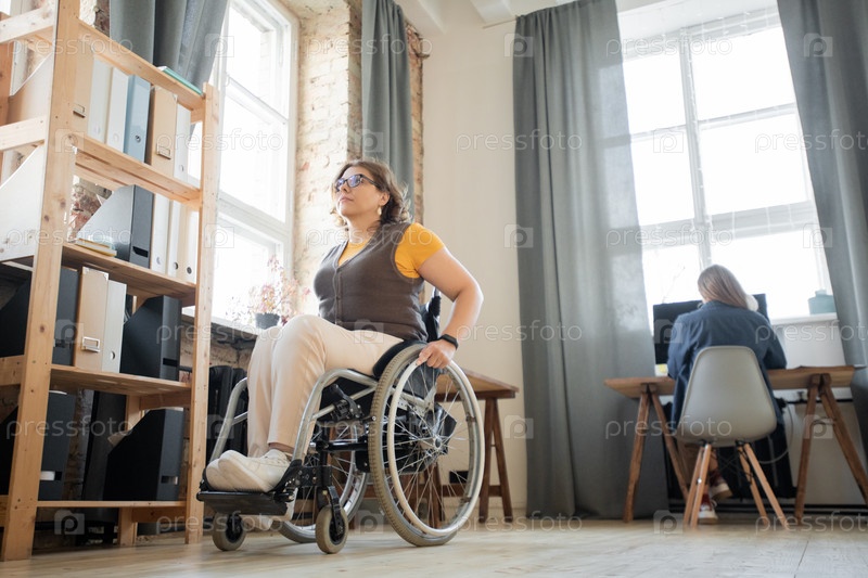 Молодая женщина-инвалид в инвалидном кресле движется к полке с деловыми документами