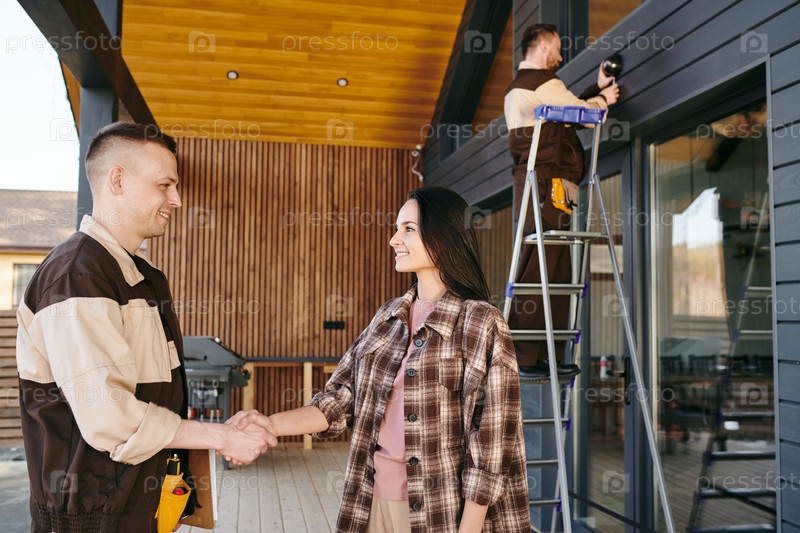 Мужчина и женщина, пожавшие друг другу руки после завершения ремонтных работ