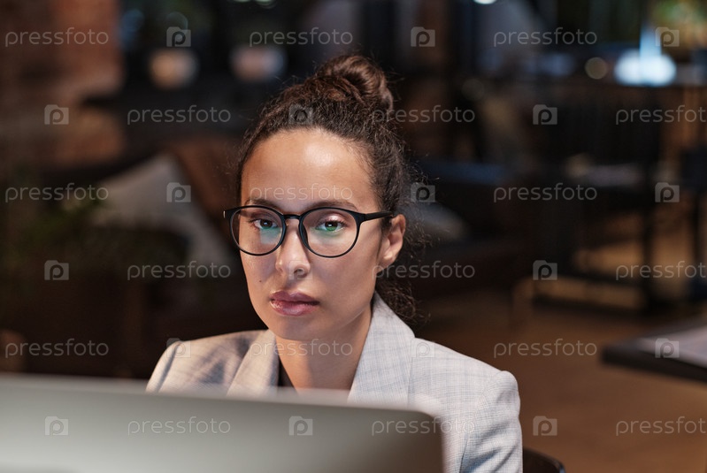Загруженная молодая латиноамериканская женщина в очках сидит в темном офисе и работает на компьютере, выполняя задания по крайней дате