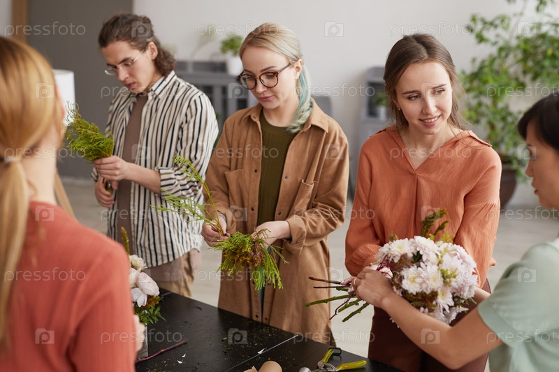 Группа людей, создающих цветочные композиции в мастерской флористов