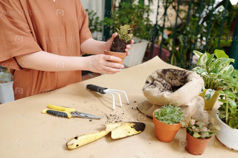 Женщина, использующая садовые инструменты при пересадке растений